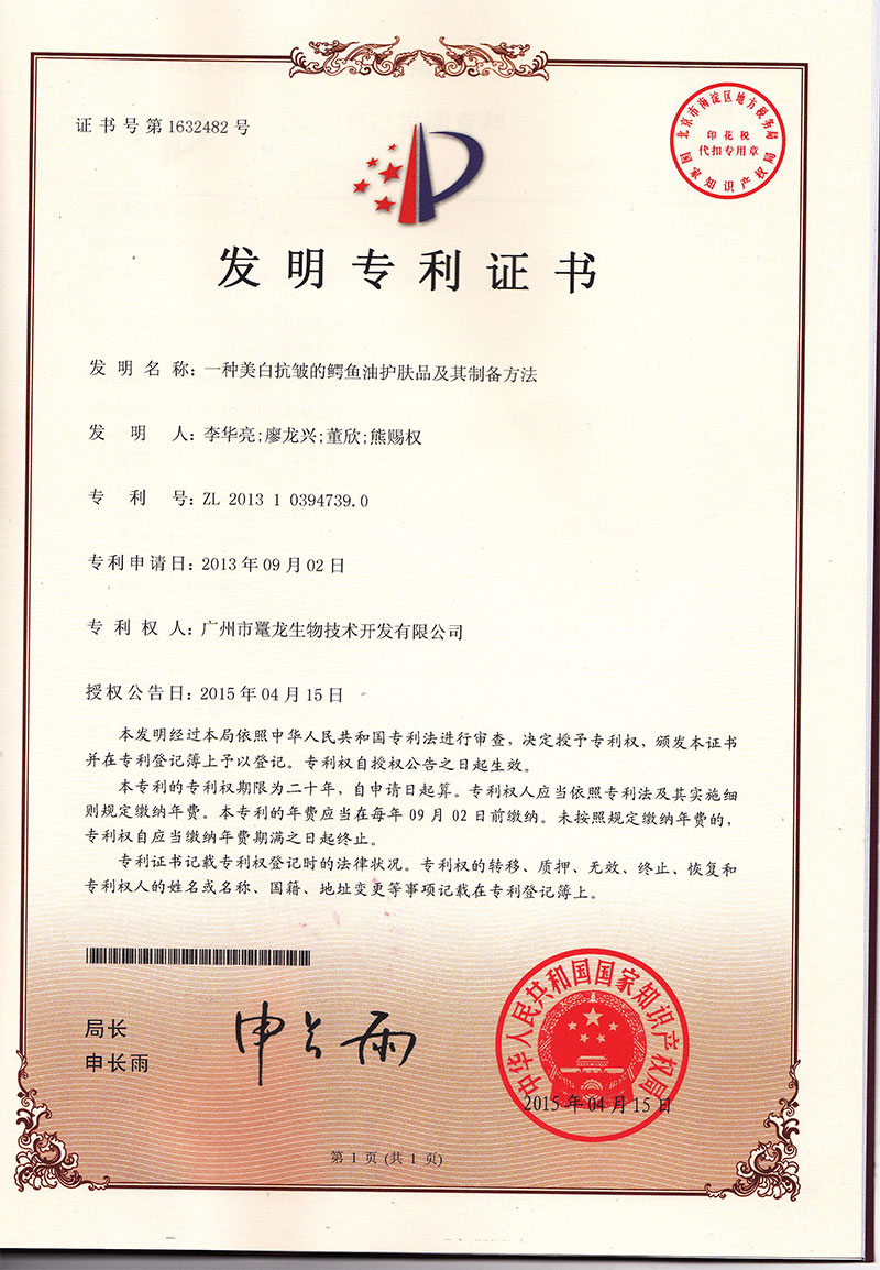 一种**抗皱的鳄鱼油护肤皮及其制备方法--专利证书