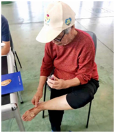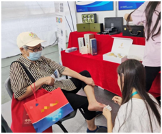 展会期间,有位被开水烫伤的老人在展会前来试用烫伤膏。